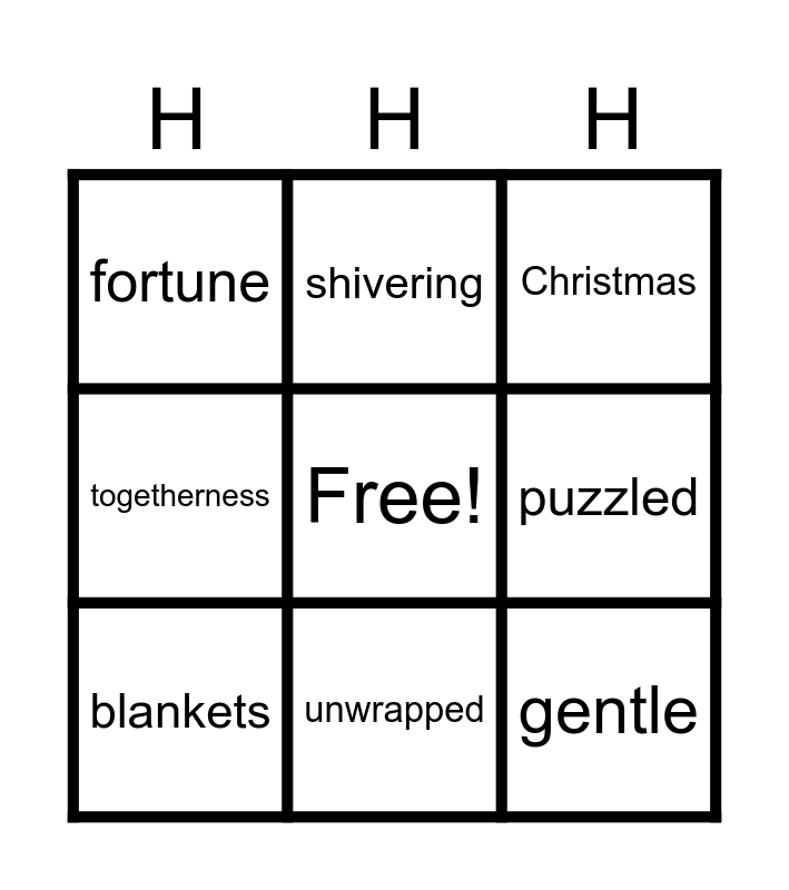 This bingo card has a free space and 25 words: eagerly, disappointed, unwrapped, grumbled, gentle, fortune, puzzled, shivering, warmth, grateful, softened, whispered, kindness, delivering, blankets, excitedly, heartfelt, Christmas, presents, kindness, joyful, generosity, reflection, togetherness and Secret Santa.