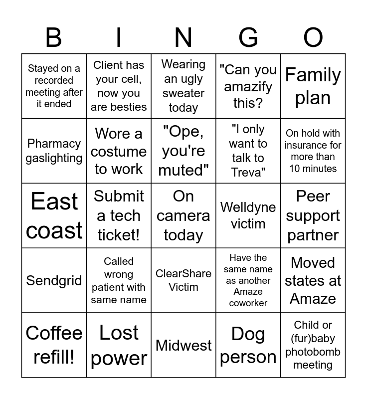 This bingo card has a free space and 95 words: Who's on EI?, Cat person, Dog person, PC person, Mac person, found a typo in the portal, Worked in Pj pants, Lost power, Lost internet, Worked during a hurricane, Scheduled patient in wrong time zone, said "circle back", Said "piggy back", "Ope, you're muted", Posted hello in wrong place, Stayed on a recorded meeting after it ended, On hold with insurance for more than 10 minutes, danced to hold music, 3+ meetings with Dave in a day, Diet coke luver, Pranked on April Fools, Rick rolled at Amaze, Posted Happy Friday when it was in fact, not Friday, Started Amaze this year, "Can you amazify this?, Pharmacy gaslighting, Sang Nelly EI, "I only want to talk to Treva", Completed your weekly feedback, Clocked in for more than 20 hours, Called wrong patient with same name, Onboarding wrong location, Posted a toilet emoji, Celsius luver, Coffee refill!, Bookings victim, Midwest, West coast, East coast, Guatemala, Moved states at Amaze, Submit a tech ticket!, ClearShare Victim, Family plan, Have the same name as another Amaze coworker, Welldyne victim, Took notes on random object, Post it notes shrine, Gif NSFW, Share picture of your dinner, Has farm animals, Met a coworker in person, Spilled coffee, What the heck is CCM?, Last minute presentation/sales call, Brought your pet to work, Follows recipes, Does not follow recipes, Treadmill desk, ALL CAPS (shannon), Wore a costume to work, Lost my note, Opt out call victim, Gone phishing, Forgot to say I'm back, Cat riding unicorn gif, Showed up to work on the wrong day, Interviewed with Dave, Wearing an ugly sweater today, Picture on Amaze website, Loves winter, Hates Winter, Child or (fur)baby photobomb meeting, NOT saved by the BELL, Speaks another language, Can I get a spanish speaker?, Saving notes for over 2 hours, Exterminator excuse, "don't judge my tabs", Client has your cell, now you are besties, Got hired because of Greg, Call back, Teams voicemail, Worked offsite, Peer support partner, Sendgrid, Referral land, Can hum the Teams incoming call tune, Lost a task, Release notes, Android, Iphone, Favorite word is paradox, Another LPR and You are twin.