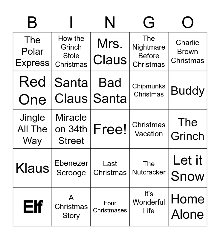 This bingo card has a free space and 29 words: Elf, Rudolph, Miracle on 34th Street, Home Alone, The Polar Express, Mrs. Claus, Santa Claus, Ebenezer Scrooge, Christmas Vacation, A Christmas Story, The Grinch, Home Alone, Four Christmases, It's Wonderful Life, Buddy, Kevin, Last Christmas, Klaus, Charlie Brown Christmas, Jingle All The Way, The Nutcracker, A Christmas Carol, Chipmunks Christmas, Red One, The Nightmare Before Christmas, How the Grinch Stole Christmas, Let it Snow, Bad Santa and Frosty the Snowman.