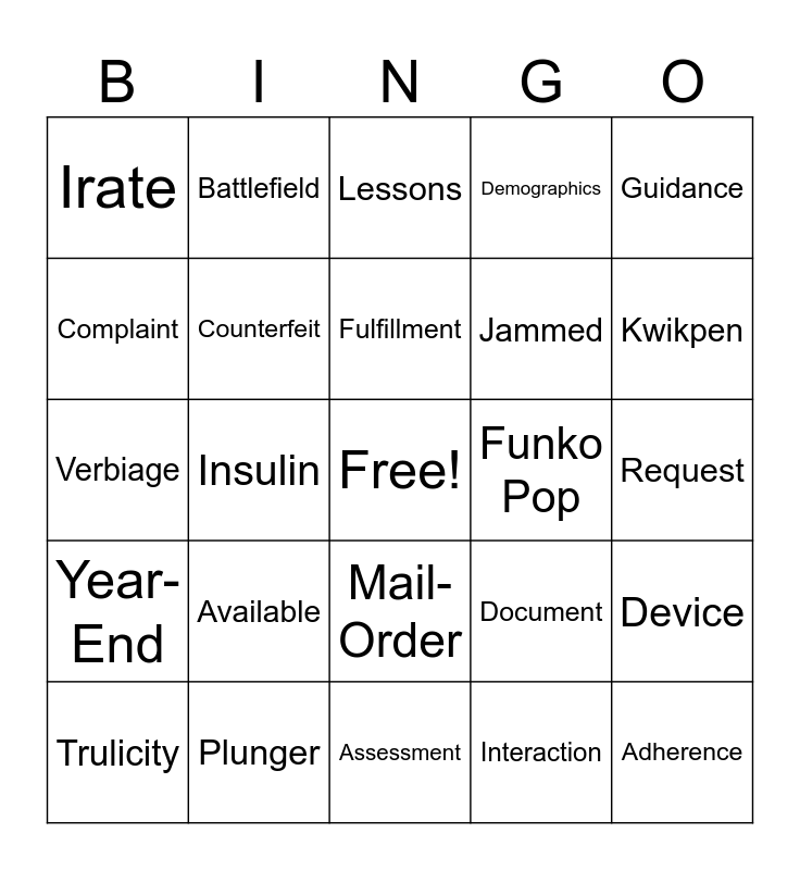 This bingo card has a free space and 50 words: A1C, Adherence, Appearance, Assessment, Available, Batch, Battlefield, Clarification, Complaint, Compounding, Counterfeit, Demographics, Device, Document, Escalation, Excursion, Fulfillment, Funko Pop, Grid, Guidance, Insulin, Interaction, Irate, Jammed, July, Jupe, Kwikpen, Learnings, Lessons, Mail-Order, Misfire, Mounjaro, Pantry, Patient, Plunger, Priority, PTO, Quality, Queue, Request, Responding, Tampering, Tenured, Tool, Trulicity, Verbiage, Verification, Vial, Year-End and Zepbound.