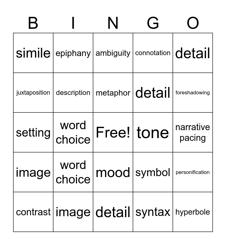 This bingo card has a free space and 24 words: word choice, image, metaphor, contrast, detail, simile, juxtaposition, epiphany, tone, mood, detail, setting, symbol, personification, description, syntax, narrative pacing, ambiguity, foreshadowing, word choice, hyperbole, image, connotation and detail.