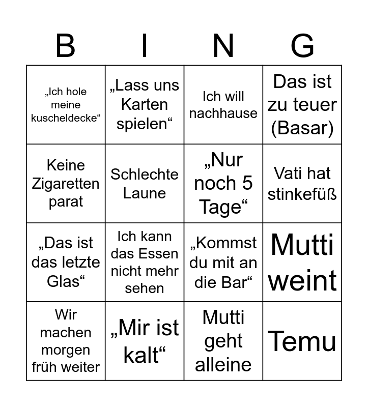 This bingo card has 16 words: „Mir ist kalt“, Mutti weint, Ich will nachhause, „Ich hole meine kuscheldecke“, „Das ist das letzte Glas“, „Lass uns Karten spielen“, „Kommst du mit an die Bar“, Mutti geht alleine, Keine Zigaretten parat, Schlechte Laune, Wir machen morgen früh weiter, Das ist zu teuer (Basar), Ich kann das Essen nicht mehr sehen, Vati hat stinkefüß, „Nur noch 5 Tage“ and Temu.