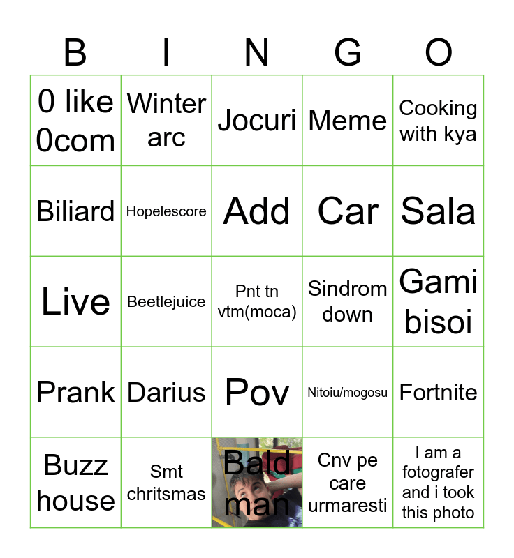 This bingo card has 1 images, a free space and 24 words: Darius, Smt chritsmas, Add, Buzz house, Cooking with kya, 0 like 0com, Biliard, Winter arc, Sindrom down, Pov, Car, Live, Nitoiu/mogosu, Fortnite, Hopelescore, Cnv pe care urmaresti, Gami bisoi, Jocuri, Sala, Beetlejuice, I am a fotografer and i took this photo, Prank, Meme and Bald man.