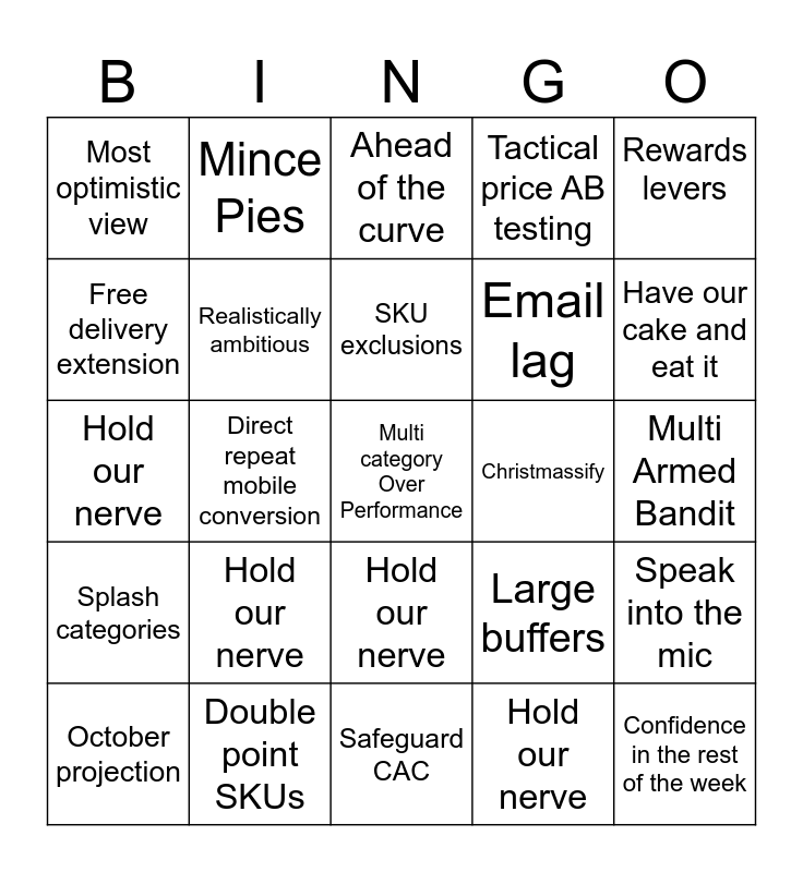 This bingo card has a free space and 25 words: Hold our nerve, Safeguard CAC, SKU exclusions, October projection, Rewards levers, Most optimistic view, Free delivery extension, Mince Pies, Christmassify, Hold our nerve, Email lag, Hold our nerve, Large buffers, Speak into the mic, Realistically ambitious, Unconstrained sales, Multi Armed Bandit, Ahead of the curve, Have our cake and eat it, Direct repeat mobile conversion, Confidence in the rest of the week, Double point SKUs, Splash categories, Tactical price AB testing and Hold our nerve.