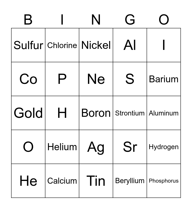 This bingo card has 70 words: Manganese, Aluminum, Carbon, Iodine, Calcium, Mn, Al, C, I, Ca, Hydrogen, Silver, Sulfur, Nickel, Oxygen, H, Ag, S, Ni, O, Strontium, Sr, Barium, Ba, Copper, Cu, Lithium, Li, Beryllium, Be, Chlorine, Potassium, Zinc, Sodium, Cobalt, Cl, K, Zn, Na, Co, Phosphorus, Helium, Boron, Fluorine, Magnesium, P, He, B, F, Mg, Nitrogen, Neon, Iron, Bromine, Tin, N, Ne, Fe, Br, Sn, Gold, Antimony, Lead, Silicon, Mercury, Au, Sb, Pb, Si and Hg.