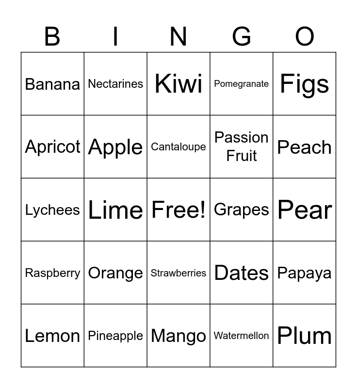 This bingo card has a free space and 29 words: Lemon, Cherry, Lime, Coconut, Banana, Kiwi, Apple, Orange, Grapes, Pineapple, Pear, Plum, Mango, Watermellon, Peach, Blueberries, Strawberries, Raspberry, Figs, Lychees, Dates, Mellon, Passion Fruit, Apricot, Pomegranate, Nectarines, Papaya, Cantaloupe and Cranberry.