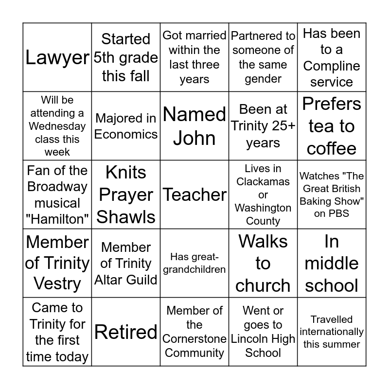 This bingo card has a free space and 24 words: Member of Trinity Altar Guild, Retired, Named John, Came to Trinity for the first time today, Has been to a Compline service, Lawyer, Will be attending a Wednesday class this week, Started 5th grade this fall, Lives in Clackamas or Washington County, Has great-grandchildren, Been at Trinity 25+ years, Fan of the Broadway musical "Hamilton", Walks to church, In middle school, Majored in Economics, Went or goes to Lincoln High School, Watches "The Great British Baking Show" on PBS, Got married within the last three years, Prefers tea to coffee, Knits Prayer Shawls, Travelled internationally this summer, Member of Trinity Vestry, Partnered to someone of the same gender and Member of the Cornerstone Community.