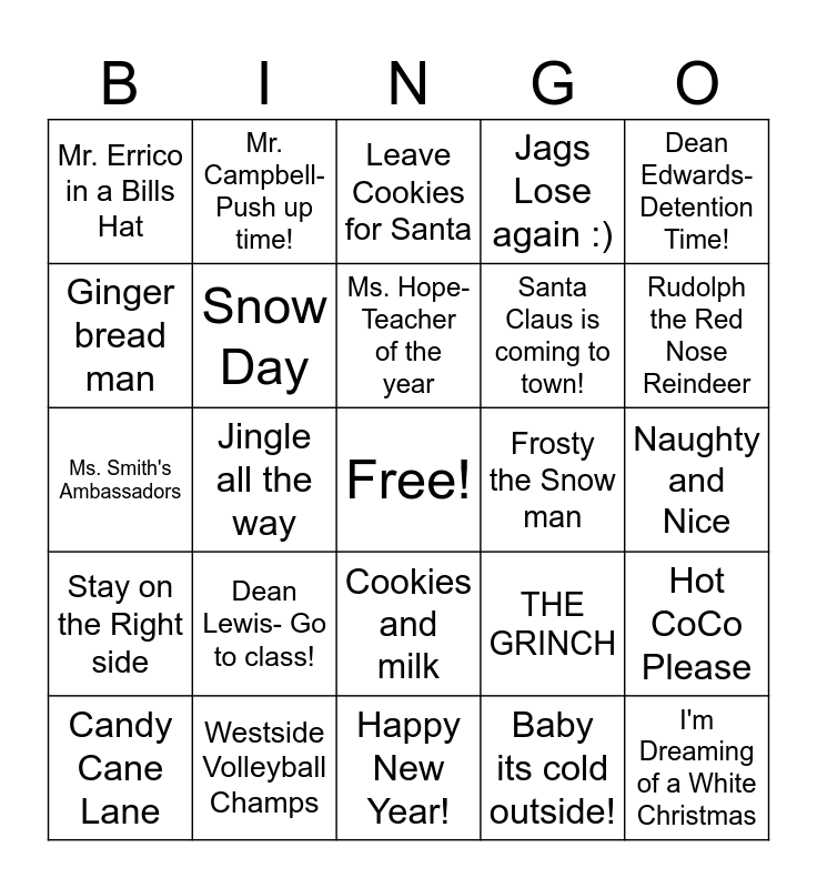 This bingo card has a free space and 24 words: Dean Lewis- Go to class!, Westside Volleyball Champs, Ms. Hope- Teacher of the year, Candy Cane Lane, Dean Edwards- Detention Time!, Mr. Errico in a Bills Hat, Ginger bread man, Mr. Campbell- Push up time!, Frosty the Snow man, Cookies and milk, Santa Claus is coming to town!, Ms. Smith's Ambassadors, THE GRINCH, Hot CoCo Please, Snow Day, Baby its cold outside!, Naughty and Nice, Leave Cookies for Santa, Rudolph the Red Nose Reindeer, Jingle all the way, I'm Dreaming of a White Christmas, Stay on the Right side, Jags Lose again :) and Happy New Year!.