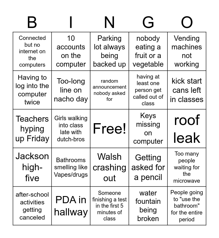 This bingo card has a free space and 24 words: Bathrooms smelling like Vapes/drugs, PDA in hallway, random announcement nobody asked for, after-school activities getting canceled, Vending machines not working, Connected but no internet on the computers, Having to log into the computer twice, 10 accounts on the computer, Keys missing on computer, Walsh crashing out, having at least one person get called out of class, Teachers hyping up Friday, Getting asked for a pencil, Too many people waiting for the microwave, Too-long line on nacho day, water fountain being broken, roof leak, Parking lot always being backed up, kick start cans left in classes, Girls walking into class late with dutch-bros, People going to "use the bathroom" for the entire period, Jackson high-five, nobody eating a fruit or a vegetable and Someone finishing a test in the first 5 minutes of class.