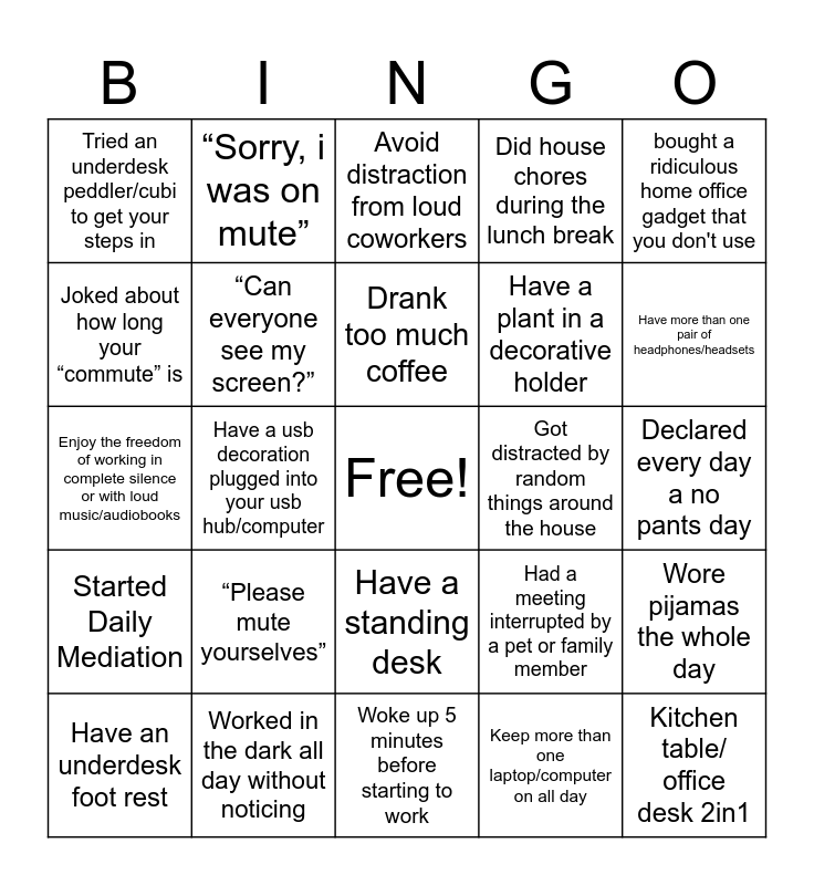 This bingo card has a free space and 46 words: Actually saw a co-worker in person, Kitchen table/ office desk 2in1, Talked to yourself, Woke up 5 minutes before starting to work, “Please mute yourselves”, Confused about what day it is, “Sorry, i was on mute”, Ate during a meeting, Joked about how long your “commute” is, Did chair yoga, “Can everyone see my screen?”, Did house chores during the lunch break, Wore pijamas the whole day, Had a meeting interrupted by a pet or family member, “Can you hear me?”, Went for a walk around the house, Drank too much coffee, Got distracted by random things around the house, First one to dial in at the meeting and sat alone for the longest minute, bought a ridiculous home office gadget that you don't use, Have a usb decoration plugged into your usb hub/computer, Keep more than one laptop/computer on all day, Tried an underdesk peddler/cubi to get your steps in, Have a plant in a decorative holder, Have a container of paperclips, binder clips, and other paper holding devices that you don't actually need or use, Have more than one pair of headphones/headsets, Have an underdesk foot rest, Tried a wierd ball or chair to have "better" posture, Have a standing desk, Started Daily Mediation, Took online continuing education courses, Read a productivity self help book, watched tv while working, Took a nap on your lunch break, Talked outloud while reading an email, Worked in the dark all day without noticing, Declared every day a no pants day, Yell at noisy neighbors instead of bad drivers, Miss the break time gossip, Am happy that you now avoid the forced interaction with strangers/near strangers while walking through the office building, Work while still in bed, Avoid distraction from loud coworkers, Enjoy the freedom of working in complete silence or with loud music/audiobooks, Started eating healthier, Made more time for Self Care and Learned a new skill work related or non work related.