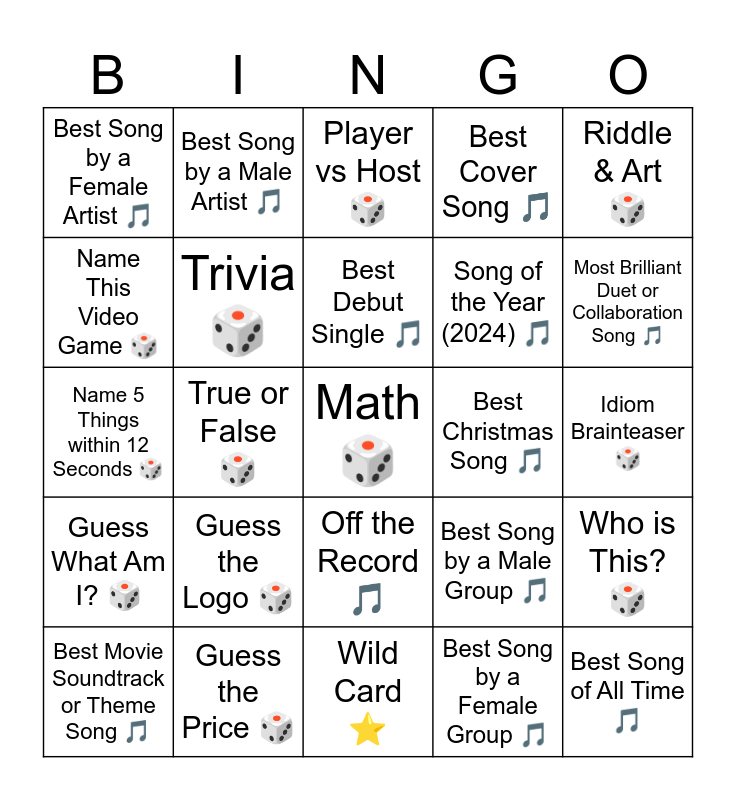This bingo card has 25 words: Guess the Logo 🎲, Wild Card ⭐, Best Debut Single 🎵, Best Movie Soundtrack or Theme Song 🎵, Riddle & Art 🎲, Best Song by a Female Artist 🎵, Name This Video Game 🎲, Best Song by a Male Artist 🎵, Best Christmas Song 🎵, Off the Record 🎵, Song of the Year (2024) 🎵, Name 5 Things within 12 Seconds 🎲, Best Song by a Male Group 🎵, Who is This? 🎲, Trivia 🎲, Best Song of All Time 🎵, Idiom Brainteaser 🎲, Player vs Host 🎲, Most Brilliant Duet or Collaboration Song 🎵, True or False 🎲, Math 🎲, Guess the Price 🎲, Guess What Am I? 🎲, Best Cover Song 🎵 and Best Song by a Female Group 🎵.