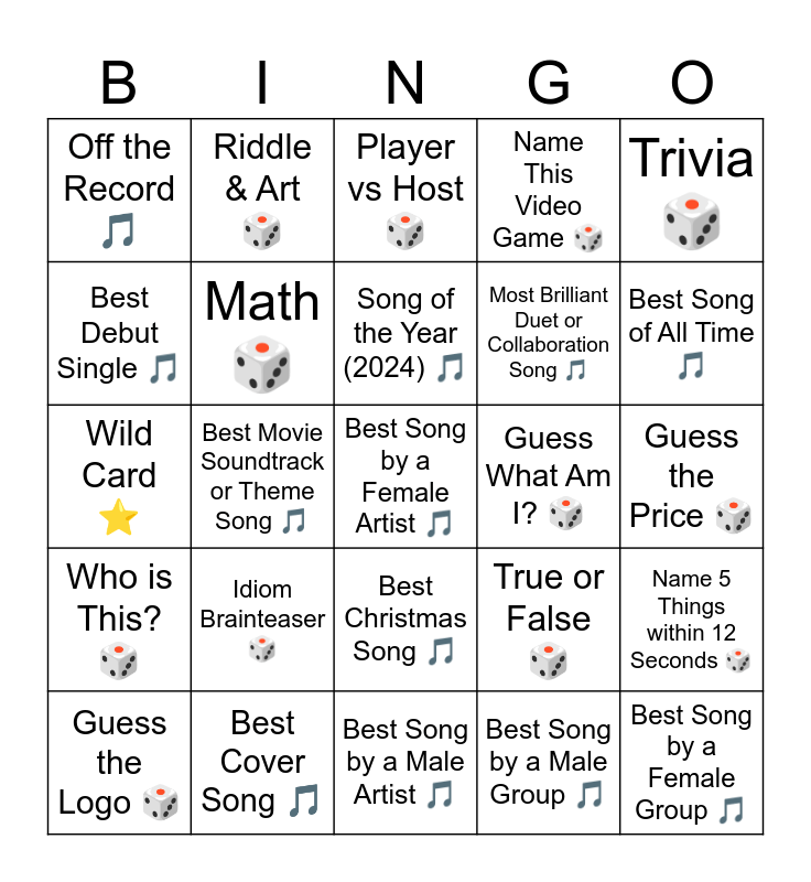 This bingo card has 25 words: Idiom Brainteaser 🎲, Best Song by a Male Artist 🎵, Song of the Year (2024) 🎵, Guess the Logo 🎲, Trivia 🎲, Off the Record 🎵, Best Debut Single 🎵, Riddle & Art 🎲, Guess What Am I? 🎲, Best Christmas Song 🎵, Most Brilliant Duet or Collaboration Song 🎵, Wild Card ⭐, True or False 🎲, Name 5 Things within 12 Seconds 🎲, Math 🎲, Best Song by a Female Group 🎵, Guess the Price 🎲, Player vs Host 🎲, Best Song of All Time 🎵, Best Movie Soundtrack or Theme Song 🎵, Best Song by a Female Artist 🎵, Best Cover Song 🎵, Who is This? 🎲, Name This Video Game 🎲 and Best Song by a Male Group 🎵.