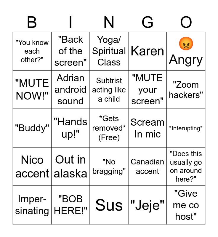 This bingo card has a free space and 24 words: Out in alaska, "BOB HERE!", Subtrist acting like a child, Imper- sinating, 😡 Angry, "You know each other?", "MUTE NOW!", "Back of the screen", Scream In mic, "No bragging", "MUTE your screen", "Buddy", Canadian accent, "Does this usually go on around here?", Adrian android sound, "Jeje", *Interupting*, Yoga/ Spiritual Class, "Zoom hackers", "Hands up!", "Give me co host", Nico accent, Karen and Sus.