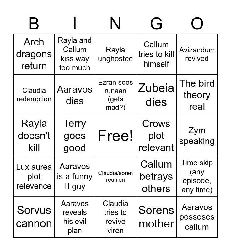 This bingo card has a free space and 24 words: Sorvus cannon, Aaravos is a funny lil guy, Ezran sees runaan (gets mad?), Sorens mother, Avizandum revived, Arch dragons return, Rayla and Callum kiss way too much, Rayla unghosted, Crows plot relevant, Zym speaking, Rayla doesn't kill, Aaravos dies, Callum betrays others, Time skip (any episode, any time), Claudia redemption, Aaravos reveals his evil plan, Claudia tries to revive viren, Callum tries to kill himself, The bird theory real, Lux aurea plot relevence, Terry goes good, Claudia/soren reunion, Zubeia dies and Aaravos posseses callum.