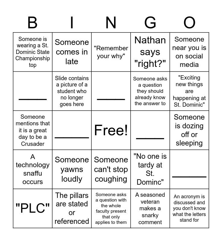 This bingo card has a free space and 24 words: "PLC", Someone yawns loudly, ___, A seasoned veteran makes a snarky comment, Someone near you is on social media, Someone is wearing a St. Dominic State Championship top, Someone comes in late, "Remember your why", ___, Someone is dozing off or sleeping, Someone mentions that it is a great day to be a Crusader, Slide contains a picture of a student who no longer goes here, "No one is tardy at St. Dominc", ____, ___, The pillars are stated or referenced, Someone asks a question with the whole faculty present that only applies to them, Nathan says "right?", "Exciting new things are happening at St. Dominic", A technology snaffu occurs, ____, Someone can't stop coughing, Someone asks a question they should already know the answer to and An acronym is discussed and you don't know what the letters stand for.