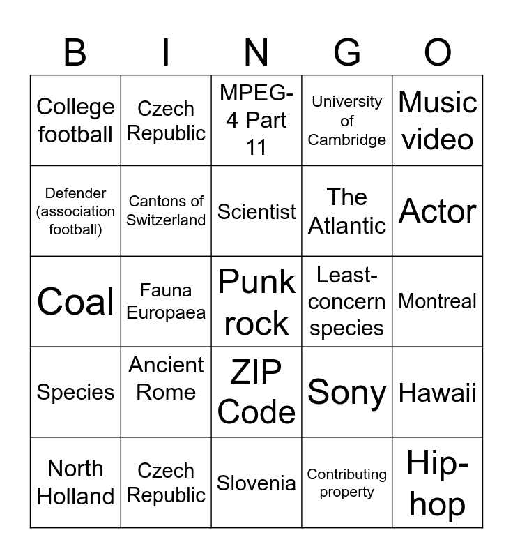 This bingo card has a free space and 24 words: Ancient Rome, Czech Republic, Scientist, North Holland, Music video, College football, Defender (association football), Czech Republic, Least-concern species, ZIP Code, The Atlantic, Coal, Sony, Hawaii, Cantons of Switzerland, Contributing property, Montreal, MPEG-4 Part 11, Actor, Fauna Europaea, Hip-hop, Species, University of Cambridge and Slovenia.