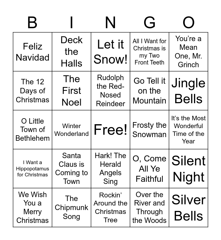 This bingo card has a free space and 25 words: Santa Claus is Coming to Town, Rockin’ Around the Christmas Tree, Rudolph the Red-Nosed Reindeer, We Wish You a Merry Christmas, You’re a Mean One, Mr. Grinch, Feliz Navidad, The 12 Days of Christmas, Deck the Halls, Frosty the Snowman, Hark! The Herald Angels Sing, Go Tell it on the Mountain, O Little Town of Bethlehem, O, Come All Ye Faithful, Silent Night, The First Noel, Jingle Bell Rock, It’s the Most Wonderful Time of the Year, Let it Snow!, Jingle Bells, Winter Wonderland, Silver Bells, The Chipmunk Song, I Want a Hippopotamus for Christmas, All I Want for Christmas is my Two Front Teeth and Over the River and Through the Woods.