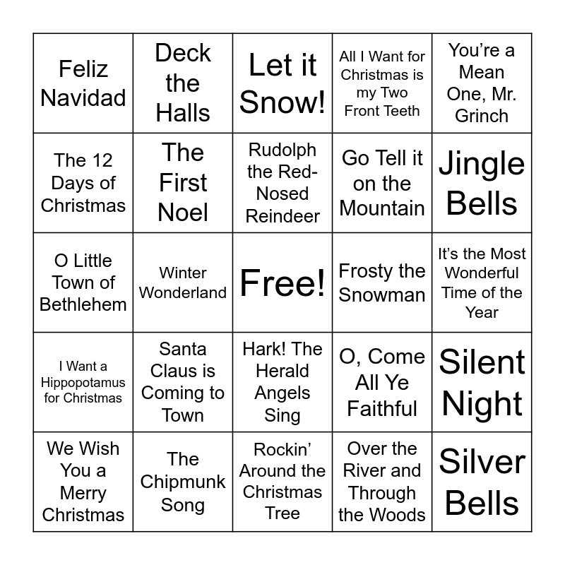 This bingo card has a free space and 25 words: Santa Claus is Coming to Town, Rockin’ Around the Christmas Tree, Rudolph the Red-Nosed Reindeer, We Wish You a Merry Christmas, You’re a Mean One, Mr. Grinch, Feliz Navidad, The 12 Days of Christmas, Deck the Halls, Frosty the Snowman, Hark! The Herald Angels Sing, Go Tell it on the Mountain, O Little Town of Bethlehem, O, Come All Ye Faithful, Silent Night, The First Noel, Jingle Bell Rock, It’s the Most Wonderful Time of the Year, Let it Snow!, Jingle Bells, Winter Wonderland, Silver Bells, The Chipmunk Song, I Want a Hippopotamus for Christmas, All I Want for Christmas is my Two Front Teeth and Over the River and Through the Woods.