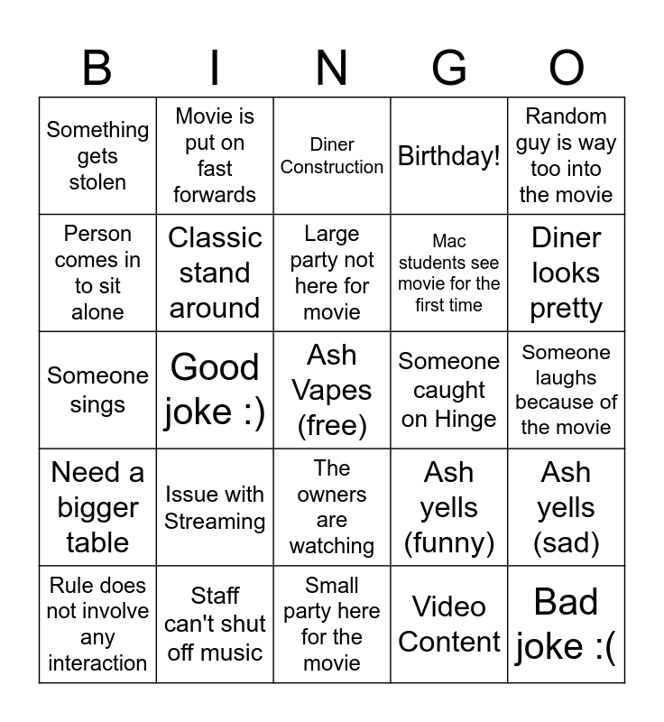 This bingo card has a free space and 24 words: Issue with Streaming, Staff can't shut off music, Large party not here for movie, Rule does not involve any interaction, Random guy is way too into the movie, Something gets stolen, Person comes in to sit alone, Movie is put on fast forwards, Someone caught on Hinge, The owners are watching, Mac students see movie for the first time, Someone sings, Ash yells (funny), Ash yells (sad), Classic stand around, Video Content, Someone laughs because of the movie, Diner Construction, Diner looks pretty, Good joke :), Bad joke :(, Need a bigger table, Birthday! and Small party here for the movie.