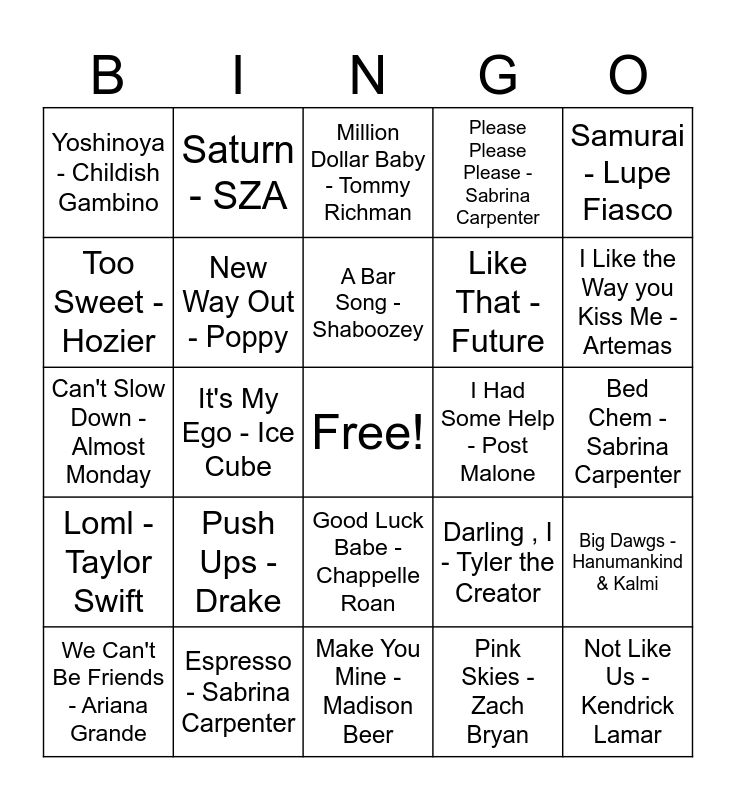 This bingo card has a free space and 35 words: TV Off - Kendrick Lamar, Lithonia - Childish Gambino, Sticky - Tyler the Creator, New Way Out - Poppy, Good Luck Babe - Chappelle Roan, Please Please Please - Sabrina Carpenter, Too Sweet - Hozier, Fortnight - Taylor Swift, A Bar Song - Shaboozey, Die with a Smile - Lady Gaga & Bruno Mars, Can't Slow Down - Almost Monday, Samurai - Lupe Fiasco, Sticks n Stonez - J Cole, Euphoria - Kendrick Lamar, Yoshinoya - Childish Gambino, I Had Some Help - Post Malone, Pink Skies - Zach Bryan, It's My Ego - Ice Cube, Loml - Taylor Swift, Not Like Us - Kendrick Lamar, Darling , I - Tyler the Creator, We Can't Be Friends - Ariana Grande, Big Dawgs - Hanumankind & Kalmi, Espresso - Sabrina Carpenter, Million Dollar Baby - Tommy Richman, I Like the Way you Kiss Me - Artemas, So Long, London - Taylor Swift, Reincarnated - Kendrick Lamar, Like That - Future, Bed Chem - Sabrina Carpenter, I Can Do It With a Broken Heart - Taylor Swift, Make You Mine - Madison Beer, Push Ups - Drake, Saturn - SZA and Down Bad - Taylor Swift.