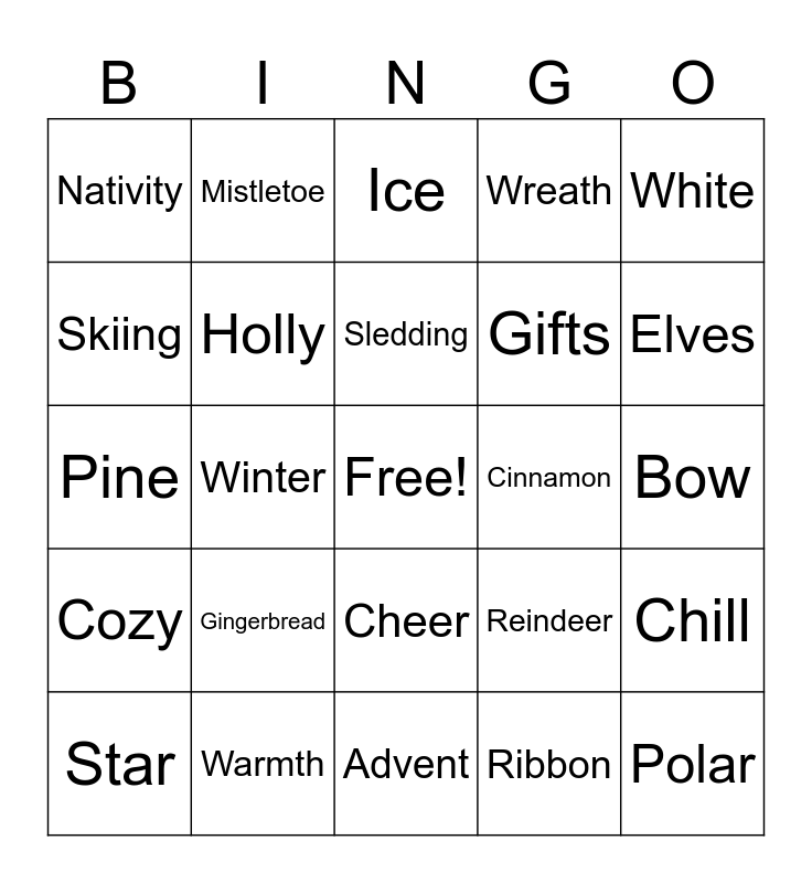 This bingo card has a free space and 75 words: Snow, Frost, Ice, Blizzard, Cold, Fireplace, Mittens, Scarf, Coat, Icicles, Snowman, Snowflake, Sledding, Skiing, Snowball, Winter, Frosty, Polar, Frozen, White, Evergreen, Pine, Holly, Mistletoe, Wreath, Garland, Ornament, Tinsel, Lights, Stockings, Chimney, Santa, Sleigh, Reindeer, Elves, Gifts, Present, Wrapping, Bow, Ribbon, Noel, Carols, Choir, Bell, Candle, Angel, Star, Nativity, Celebration, Joy, Peace, Cheer, Love, Family, Friends, Gatherings, Feast, Turkey, Ham, Pudding, Gingerbread, Cookies, Hot cocoa, Marshmallows, Eggnog, Cinnamon, Peppermint, Candy cane, Frostbite, Chill, Cozy, Warmth, North Pole, Advent and Holiday.
