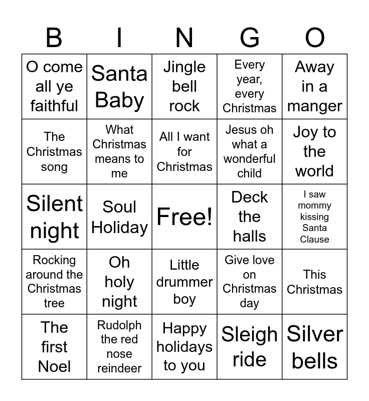 This bingo card has a free space and 29 words: The first Noel, Santa Clause is coming to town, Soul Holiday, Tis the season, O come all ye faithful, Jingle bell rock, What Christmas means to me, Oh holy night, Deck the halls, Rudolph the red nose reindeer, I saw mommy kissing Santa Clause, Silver bells, Happy holidays to you, Sleigh ride, Joy to the world, Do you hear what I hear?, Little drummer boy, Rocking around the Christmas tree, Away in a manger, Silent night, Give love on Christmas day, Let it snow, Jesus oh what a wonderful child, The Christmas song, Every year, every Christmas, Santa Baby, This Christmas, All I want for Christmas and Have yourself a merry Christmas.