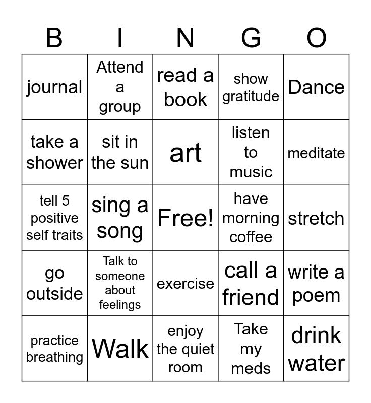 This bingo card has a free space and 24 words: Talk to someone about feelings, Walk, art, practice breathing, Dance, journal, take a shower, Attend a group, have morning coffee, exercise, listen to music, tell 5 positive self traits, call a friend, write a poem, sit in the sun, Take my meds, stretch, read a book, meditate, sing a song, drink water, go outside, show gratitude and enjoy the quiet room.