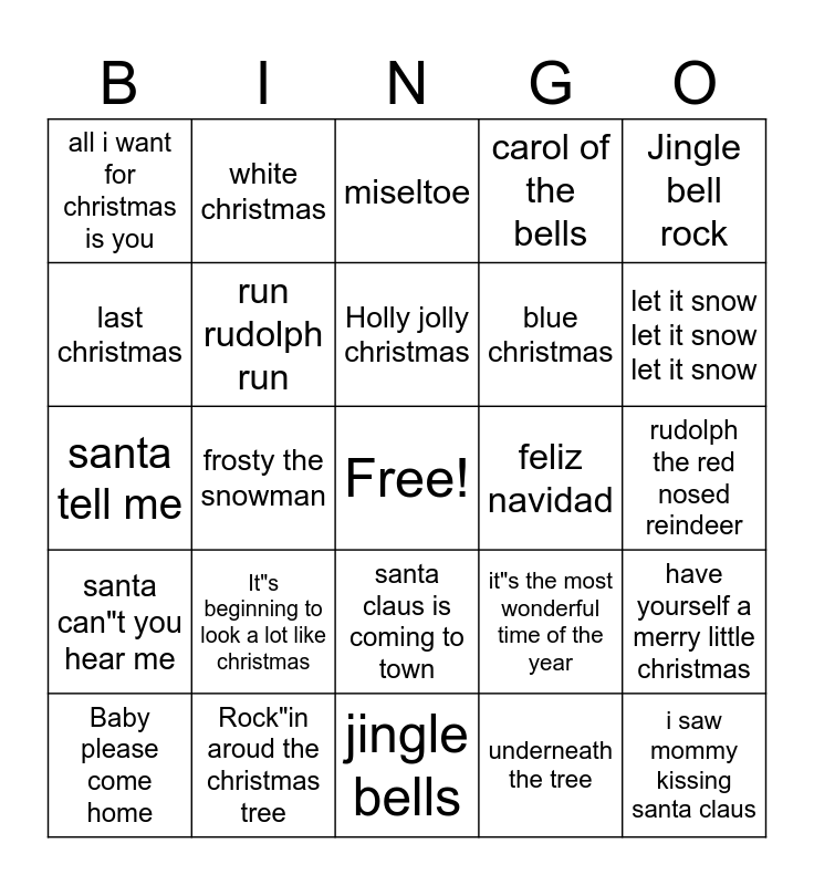 This bingo card has a free space and 24 words: It"s beginning to look a lot like christmas, Rock"in aroud the christmas tree, Holly jolly christmas, Baby please come home, Jingle bell rock, all i want for christmas is you, last christmas, white christmas, feliz navidad, santa claus is coming to town, blue christmas, santa tell me, it"s the most wonderful time of the year, have yourself a merry little christmas, run rudolph run, underneath the tree, rudolph the red nosed reindeer, miseltoe, let it snow let it snow let it snow, frosty the snowman, i saw mommy kissing santa claus, santa can"t you hear me, carol of the bells and jingle bells.