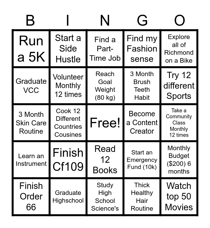 This bingo card has a free space and 24 words: Finish Cf109, Graduate Highschool, Reach Goal Weight (80 kg), Finish Order 66, Explore all of Richmond on a Bike, Run a 5K, Graduate VCC, Start a Side Hustle, Become a Content Creator, Read 12 Books, 3 Month Brush Teeth Habit, 3 Month Skin Care Routine, Start an Emergency Fund (10k), Monthly Budget ($200) 6 months, Volunteer Monthly 12 times, Thick Healthy Hair Routine, Take a Community Class Monthly 12 times, Find a Part-Time Job, Try 12 different Sports, Cook 12 Different Countries Cousines, Watch top 50 Movies, Learn an Instrument, Find my Fashion sense and Study High School Science's.
