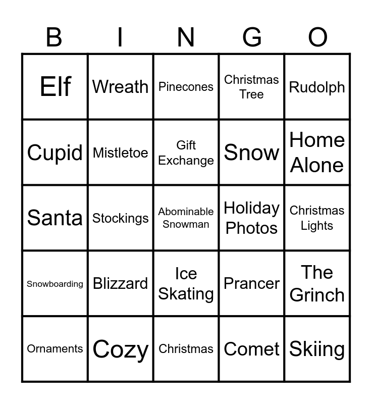 This bingo card has 71 words: Free!, Wreath, Snowglobe, Winter, Christmas, Presents, Christmas Tree, Feliz Navidad, Snow, Frosty the Snowman, Ornaments, Dasher, Home Alone, Elf, North Pole, Santa, Prancer, Rudolph, Mrs. Claus, Christmas Lights, Blizzard, Abominable Snowman, The Grinch, Whoville, Christmas Village, Hot Cocoa, Cookies, Holiday Party, Christmas Eve, Pajamas, Cozy, Hallmark Movies, Dancer, Vixen, Comet, Sleigh, Donner, Letters to Santa, Cupid, Snowmobile, Ice Skating, Skiing, Snowboarding, Silent Night, Holly Jolly, Snowflakes, Gingerbread House, Mistletoe, Candy Canes, Rockin Around the Christmas Tree, Silver Bells, Santa Baby, Holiday Photos, Christmas Cards, Marshmallows, Secret Santa, Gift Exchange, Chocolates, Wine Basket, Eggnog, Jingle Bells, Nightmare Before Christmas, Stockings, Toy Trains, Cinnamon, Chestnuts, Pinecones, Nutcracker, Penguins, Polar Bears and The Polar Express.