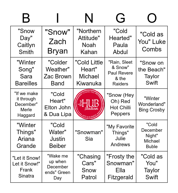 This bingo card has a free space and 37 words: "Snowfall" Ingrid Michaelson, "The Frozen Man" James Taylor, "A Hazy Shade of Winter" Simon & Garfunkel, "Colder Weather" Zac Brown Band, "Cold December Night" Michael Buble, "Cold Water" Justin Beiber, "Cold Little Heart" Michael Kiwanuka, "Cold" Maroon 5, "Cold as You" Luke Combs, "Baby it's Cold Outside" Dean Martin, "Cold Heart" Elton John & Dua Lipa, "Cold Hearted" Paula Abdul, "Cold as You" Taylor Swift, "Winter Wonderland" Bing Crosby, "Winter Song" Sara Bareilles, "Winter Things" Ariana Grande, "Stick Season" Noah Kahan, "Northern Attitude" Noah Kahan, "Snowman" Sia, "Snow (Hey Oh) Red Hot Chilli Peppers, "Snow Day" Caitlyn Smith, "Snow on the Beach" Taylor Swift, "Let it Snow! Let it Snow!" Frank Sinatra, "Chasing Cars" Snow Patrol, "Do you want to build a snowman?" Kristen Bell, "Frosty the Snowman" Ella Fitzgerald, "Snow" Zach Bryan, "cardigan" Taylor Swift, "Back in December" Taylor Swift, "Winterlude" Bob Dylan, "December, 1963" Frankie Valli, "Wake me up when December ends" Green Day, "If we make it through December" Merle Haggard, "Ice Ice Baby" Vanilla Ice, "My Favorite Things" Julie Andrews, "Rain, Sleet & Snow" Paul Revere & the Raiders and "Mittens" Carly Rae Jepsen.