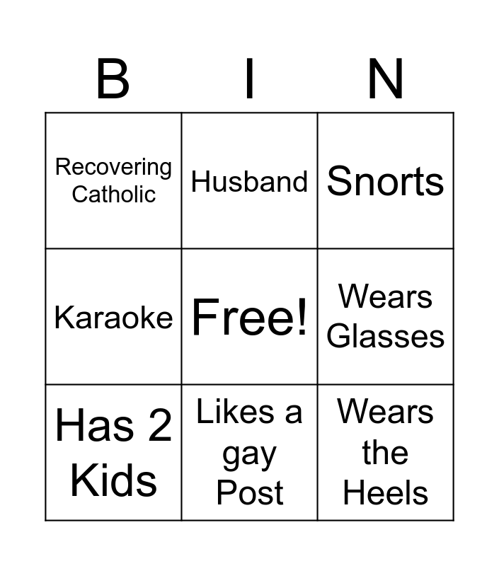 This bingo card has a free space and 9 words: Has 2 Kids, Snorts, Husband, Karaoke, Recovering Catholic, Wears Glasses, Wears the Heels, Messes up on IG and Likes a gay Post.