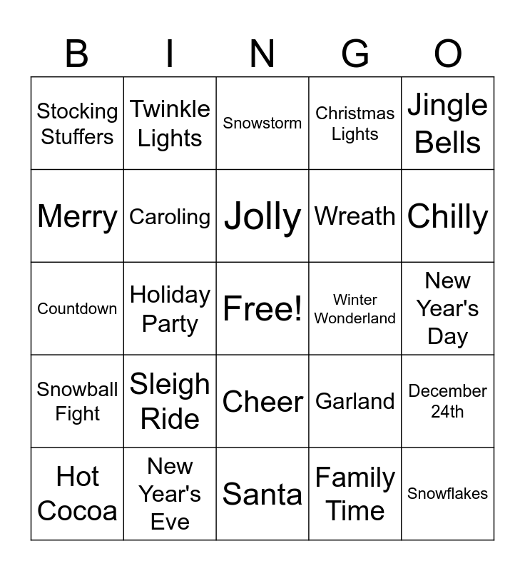 This bingo card has a free space and 44 words: Mistletoe, Snowflakes, Ugly Sweater, Hot Cocoa, Candy Canes, Family Time, Snowstorm, Gift Wrap, Jingle Bells, New Year's Eve, Christmas Lights, Winter Wonderland, Cheer, Sleigh Ride, Festive, Santa, Cookies, Countdown, Reindeer, Chilly, Twinkle Lights, Tinsel, Eggnog, Stocking Stuffers, Frosty the Snowman, New Year's Day, Gingerbread, Icicles, Garland, Snowball Fight, December 25th, December 24th, North Pole, Peppermint, Holiday Party, Angel, Feliz Navidad, Snowman, Jolly, Merry, Wreath, Secret Santa, Caroling and Snow Angels.