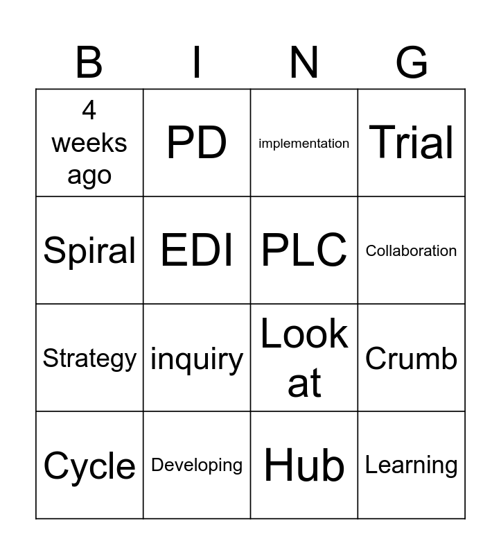 This bingo card has 23 words: Learning, Data, Collaboration, Teams, Spiral, 4 weeks ago, EDI, PD, Cycle, Cake, inquiry, Strategy, Feedback, Scanning, Developing, Norms, implementation, Look at, PLC, Crumb, Trial, Hub and Probing.