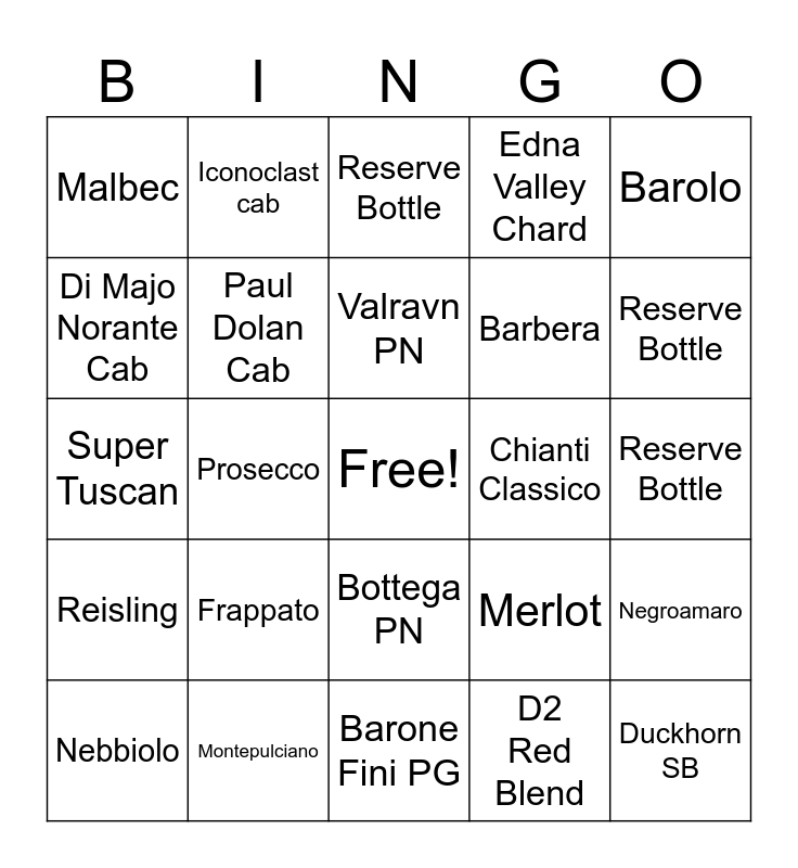 This bingo card has a free space and 24 words: Frappato, Montepulciano, Valravn PN, Nebbiolo, Barolo, Malbec, Di Majo Norante Cab, Iconoclast cab, Chianti Classico, Bottega PN, Barbera, Super Tuscan, Merlot, Negroamaro, Paul Dolan Cab, D2 Red Blend, Reserve Bottle, Reserve Bottle, Reserve Bottle, Prosecco, Duckhorn SB, Reisling, Edna Valley Chard and Barone Fini PG.