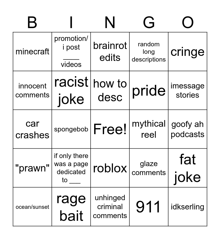 This bingo card has a free space and 24 words: if only there was a page dedicated to ___, rage bait, how to desc, ocean/sunset, cringe, minecraft, innocent comments, promotion/ i post ____ videos, mythical reel, roblox, pride, car crashes, glaze comments, fat joke, racist joke, 911, goofy ah podcasts, brainrot edits, imessage stories, spongebob, idkserling, "prawn", random long descriptions and unhinged criminal comments.