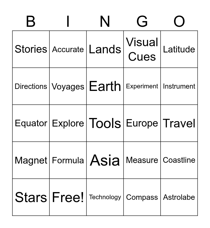 This bingo card has 30 words: Free!, Century, Explore, Sailors, Stories, Lands, Voyages, Asia, Europe, Technology, Travel, Tools, Compass, Astrolabe, Instrument, Navigate, Measure, Magnet, Formula, Latitude, Equator, Ocean, Accurate, Experiment, Directions, Visual Cues, Coastline, Stars, Earth and North.