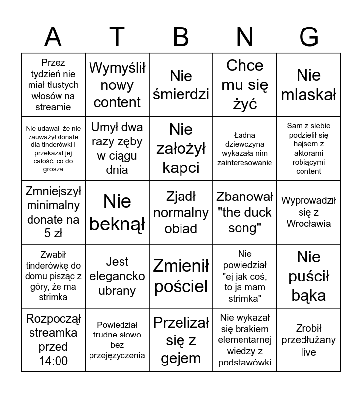 This bingo card has a free space and 24 words: Jest elegancko ubrany, Powiedział trudne słowo bez przejęzyczenia, Nie założył kapci, Rozpoczął streamka przed 14:00, Nie mlaskał, Przez tydzień nie miał tłustych włosów na streamie, Nie udawał, że nie zauważył donate dla tinderówki i przekazał jej całość, co do grosza, Wymyślił nowy content, Zbanował "the duck song", Zmienił pościel, Ładna dziewczyna wykazała nim zainteresowanie, Zmniejszył minimalny donate na 5 zł, Nie powiedział "ej jak coś, to ja mam strimka", Nie puścił bąka, Umył dwa razy zęby w ciągu dnia, Nie wykazał się brakiem elementarnej wiedzy z podstawówki, Wyprowadził się z Wrocławia, Nie śmierdzi, Sam z siebie podzielił się hajsem z aktorami robiącymi content, Nie beknął, Zrobił przedłużany live, Zwabił tinderówkę do domu pisząc z góry, że ma strimka, Chce mu się żyć and Przelizał się z gejem.