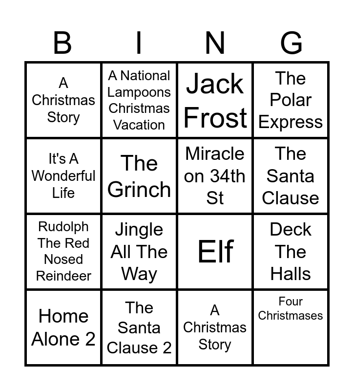 This bingo card has 16 words: The Santa Clause 2, Deck The Halls, Jack Frost, A Christmas Story, Rudolph The Red Nosed Reindeer, A National Lampoons Christmas Vacation, Elf, A Christmas Story, It's A Wonderful Life, The Grinch, Home Alone 2, The Polar Express, Jingle All The Way, The Santa Clause, Miracle on 34th St and Four Christmases.