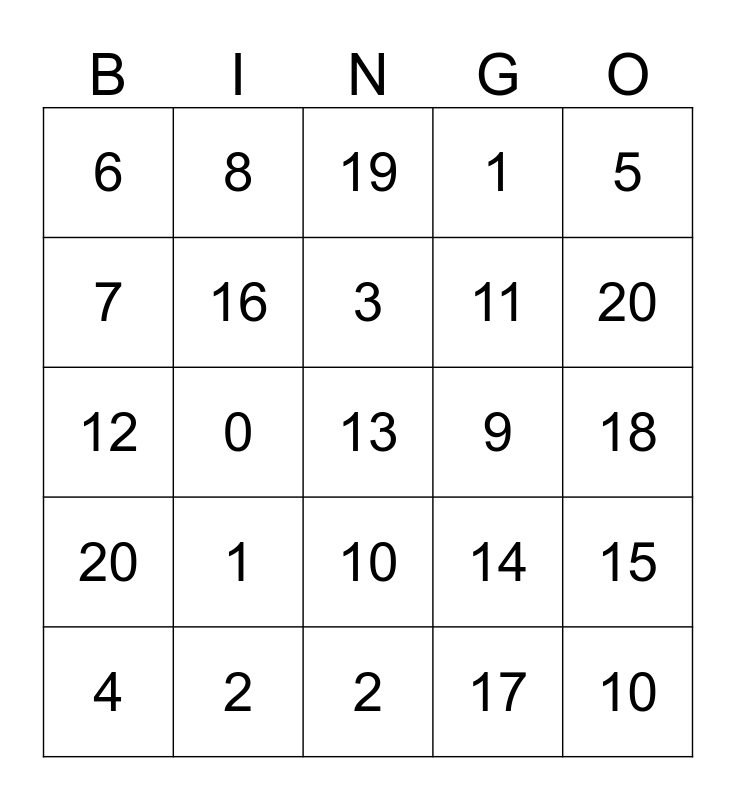 This bingo card has a free space and 24 words: 1, 2, 3, 4, 5, 6, 7, 8, 9, 10, 11, 12, 14, 15, 16, 17, 18, 19, 20, 0, 10, 20, 1 and 2.