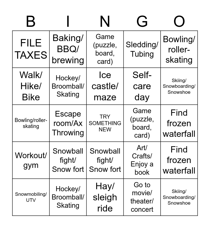 ⚠ This card has duplicate items: Skiing/ Snowboarding/ Snowshoe (2), Snowmobiling/ UTV (2), Snowball fight/ Snow fort (2), Baking/ BBQ/ brewing (2), Catch a snowflake w/tongue (2), Snow removal (2), Hockey/ Broomball/ Skating (2), Find frozen waterfall (2), Art/ Crafts/ Enjoy a book (2), Snow Angel/ Snowman (2), Game (puzzle, board, card) (2), Museum/ library (2), Escape room/Ax Throwing (2), Go to movie/ theater/ concert (2), FILE TAXES (2)