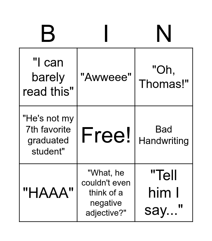 This bingo card has a free space and 8 words: Bad Handwriting, "Oh, Thomas!", "Awweee", "HAAA", "I can barely read this", "Tell him I say...", "He's not my 7th favorite graduated student" and "What, he couldn't even think of a negative adjective?".