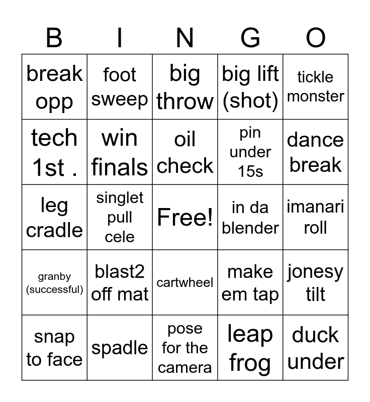This bingo card has a free space and 24 words: blast2 off mat, spadle, oil check, snap to face, tickle monster, break opp, tech 1st ., foot sweep, in da blender, cartwheel, pin under 15s, leg cradle, make em tap, jonesy tilt, win finals, leap frog, imanari roll, big throw, dance break, singlet pull cele, duck under, granby (successful), big lift (shot) and pose for the camera.
