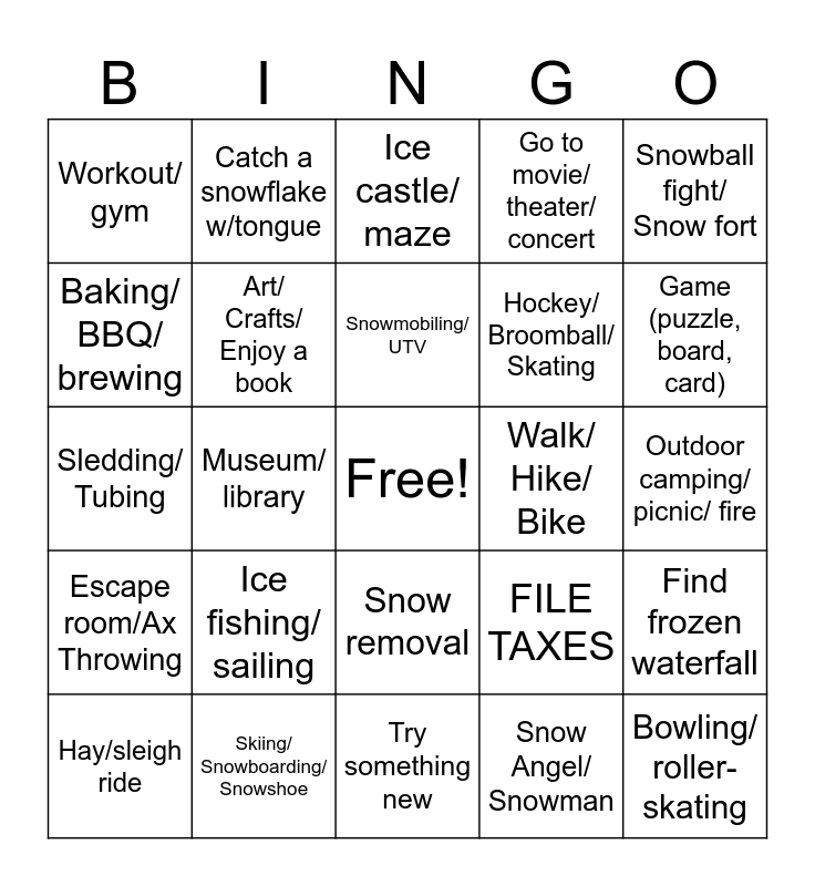 This bingo card has a free space and 24 words: Ice fishing/ sailing, Skiing/ Snowboarding/ Snowshoe, Snowmobiling/ UTV, Hay/sleigh ride, Snowball fight/ Snow fort, Workout/ gym, Baking/ BBQ/ brewing, Catch a snowflake w/tongue, Walk/ Hike/ Bike, Snow removal, Hockey/ Broomball/ Skating, Sledding/ Tubing, FILE TAXES, Find frozen waterfall, Art/ Crafts/ Enjoy a book, Snow Angel/ Snowman, Outdoor camping/ picnic/ fire, Ice castle/ maze, Game (puzzle, board, card), Museum/ library, Bowling/ roller-skating, Escape room/Ax Throwing, Go to movie/ theater/ concert and Try something new.