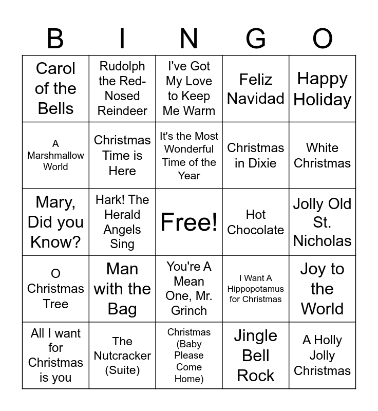 This bingo card has a free space and 55 words: All I want for Christmas is my two front teeth, All I want for Christmas is you, Baby, It's Cold Outside, Carol of the Bells, Christmas (Baby Please Come Home), Christmas Cookies, Christmas Time is Here, Christmas Vacation, Christmas in Dixie, Do You Hear What I Hear?, Feliz Navidad, Frosty the Snowman, Go Tell It On The Mountain, God Rest Ye Merry Gentlemen, Grandma Got Run Over By A Reindeer, Grown Up Christmas List, Happy Holiday, Hark! The Herald Angels Sing, Here We Come a-Caroling, A Holly Jolly Christmas, Hot Chocolate, I Saw Mommy Kissing Santa Clause, I Want A Hippopotamus for Christmas, I've Got My Love to Keep Me Warm, It's Beginning to Look a Lot Like Christmas, It's the Most Wonderful Time of the Year, Jingle Bell Rock, Jingle Bells, Jolly Old St. Nicholas, Joy to the World, Last Christmas, Let It Snow! Let It Snow! Let It Snow!, Little Drummer Boy, Little Saint Nick, A Marshmallow World, Mary, Did you Know?, Mele Kalikimaka, O Christmas Tree, O Holy Night, Rockin' Around the Christmas Tree, Rudolph the Red-Nosed Reindeer, Santa Clause is Coming to Town, Sleigh Ride, The Christmas Song, Man with the Bag, The Nutcracker (Suite), Trim Up the Tree, Twelve Days of Christmas, Up on the House Top, White Christmas, Winter Wonderland, With Bells On, Wonderful Christmastime, You're A Mean One, Mr. Grinch and I'll Be Home for Christmas.