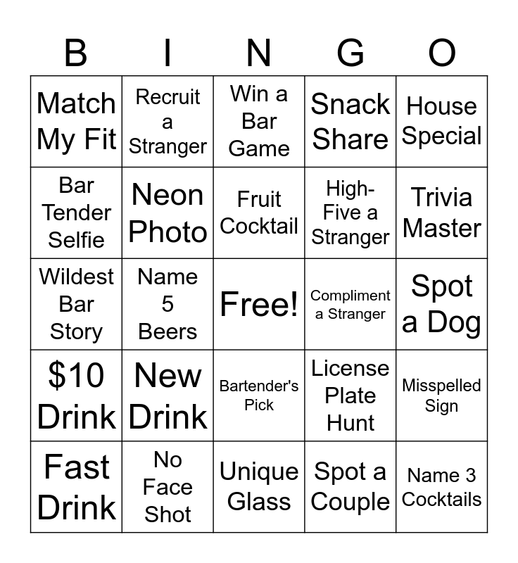 This bingo card has a free space and 24 words: New Drink, No Face Shot, Fruit Cocktail, Fast Drink, House Special, Match My Fit, Bar Tender Selfie, Recruit a Stranger, Compliment a Stranger, Bartender's Pick, High-Five a Stranger, Wildest Bar Story, License Plate Hunt, Misspelled Sign, Neon Photo, Spot a Couple, Spot a Dog, Win a Bar Game, Trivia Master, Name 5 Beers, Name 3 Cocktails, $10 Drink, Snack Share and Unique Glass.