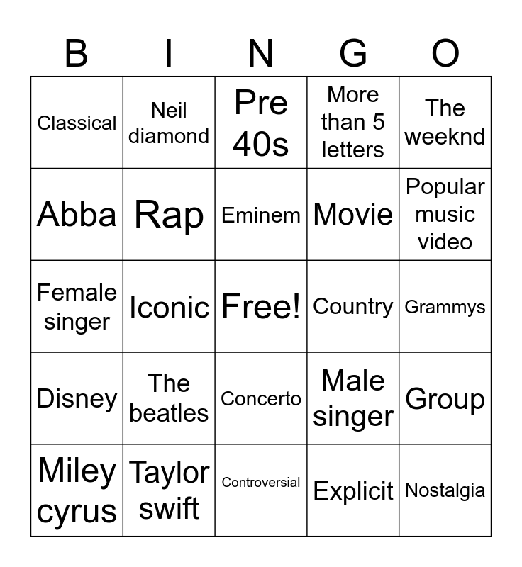 This bingo card has a free space and 24 words: The beatles, Taylor swift, Eminem, Miley cyrus, The weeknd, Classical, Abba, Neil diamond, Country, Concerto, Movie, Female singer, Male singer, Group, Rap, Explicit, Grammys, Pre 40s, Popular music video, Iconic, Nostalgia, Disney, More than 5 letters and Controversial.
