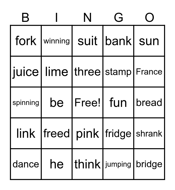 This bingo card has a free space and 24 words: freed, he, three, dance, sun, fork, juice, winning, fun, pink, stamp, spinning, fridge, shrank, lime, jumping, bread, suit, France, be, bridge, link, bank and think.
