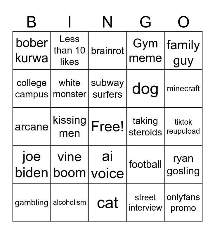 This bingo card has a free space and 24 words: vine boom, alcoholism, subway surfers, gambling, family guy, bober kurwa, college campus, Less than 10 likes, taking steroids, ai voice, dog, arcane, football, ryan gosling, white monster, street interview, tiktok reupuload, brainrot, minecraft, kissing men, onlyfans promo, joe biden, Gym meme and cat.