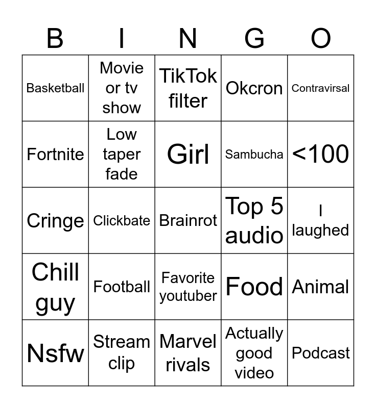 This bingo card has a free space and 24 words: Football, Stream clip, Girl, Nsfw, Contravirsal, Basketball, Fortnite, Movie or tv show, Top 5 audio, Favorite youtuber, Sambucha, Cringe, Food, Animal, Low taper fade, Actually good video, I laughed, TikTok filter, <100, Clickbate, Podcast, Chill guy, Okcron and Marvel rivals.